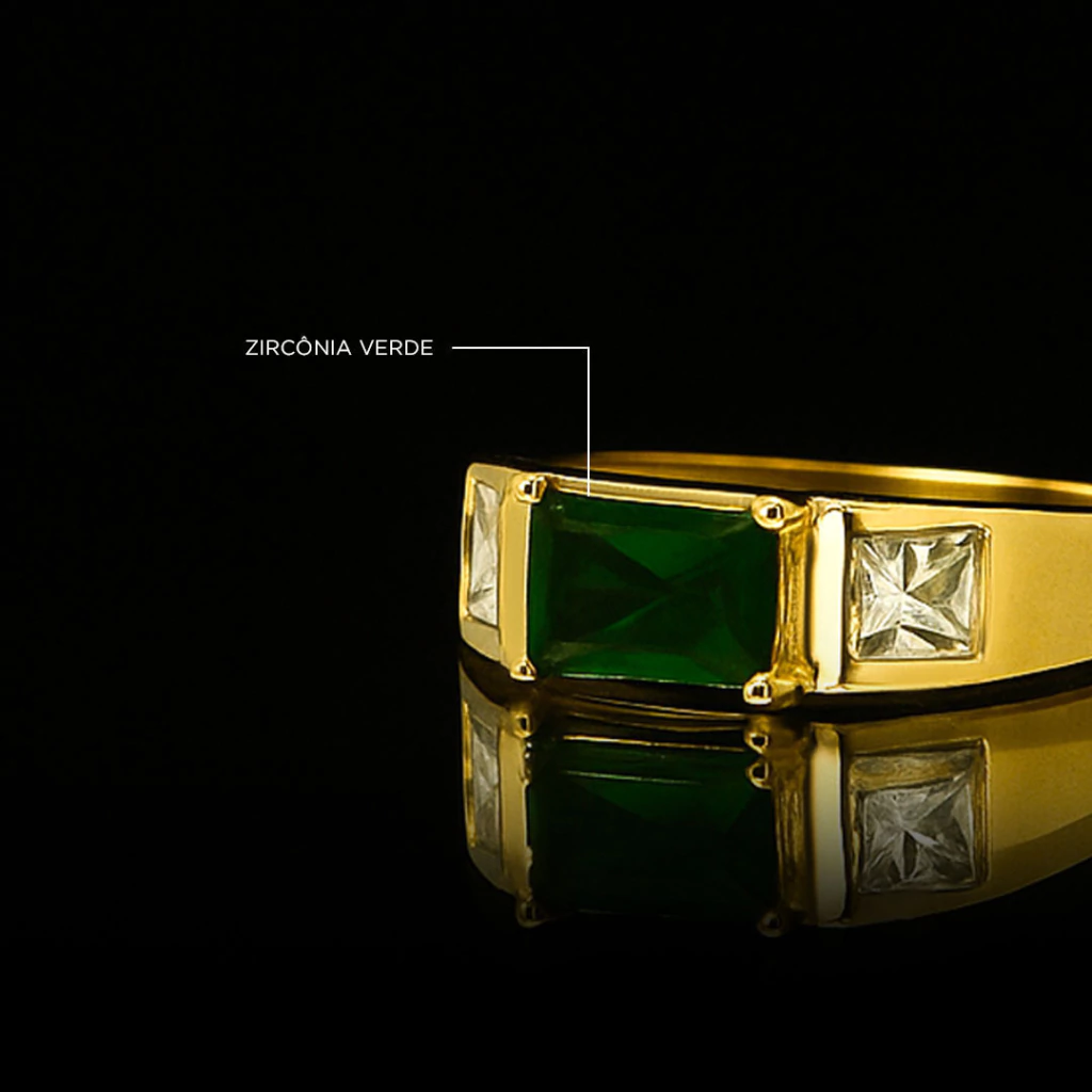 Realce sua beleza e expresse sua personalidade com o Anel Pedra Verde Cravejado Banhado a Ouro 18K, uma joia que une luxo, autenticidade e qualidade incomparável!