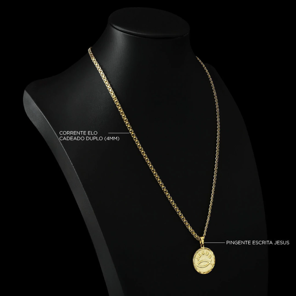 Destaque sua fé e seu estilo com a Corrente Elo Cadeado Duplo 4mm e o Pingente Jesus banhados a Ouro 18K. Uma joia exclusiva, resistente e cheia de significado para te acompanhar sempre!