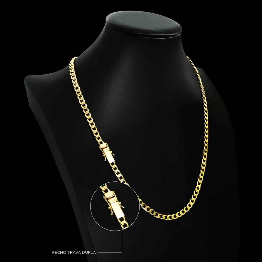 Transforme seu visual com a Corrente Grumet Fecho Trava Dupla (5,5mm) banhada a Ouro 18K — uma joia resistente, segura e cheia de estilo para acompanhar você em todos os momentos!