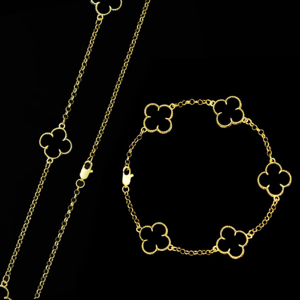 Combine a corrente e a pulseira trevo preto para um visual impactante ou use cada peça individualmente, criando composições únicas para diferentes ocasiões. O acabamento preto é tendência e combina com roupas claras ou escuras, sendo uma excelente escolha para quem deseja destaque com discrição.