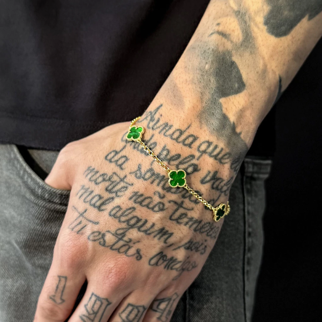 Garanta já a sua Pulseira Trevo Verde Banhada a Ouro 18K e destaque-se com beleza, sorte e exclusividade!
